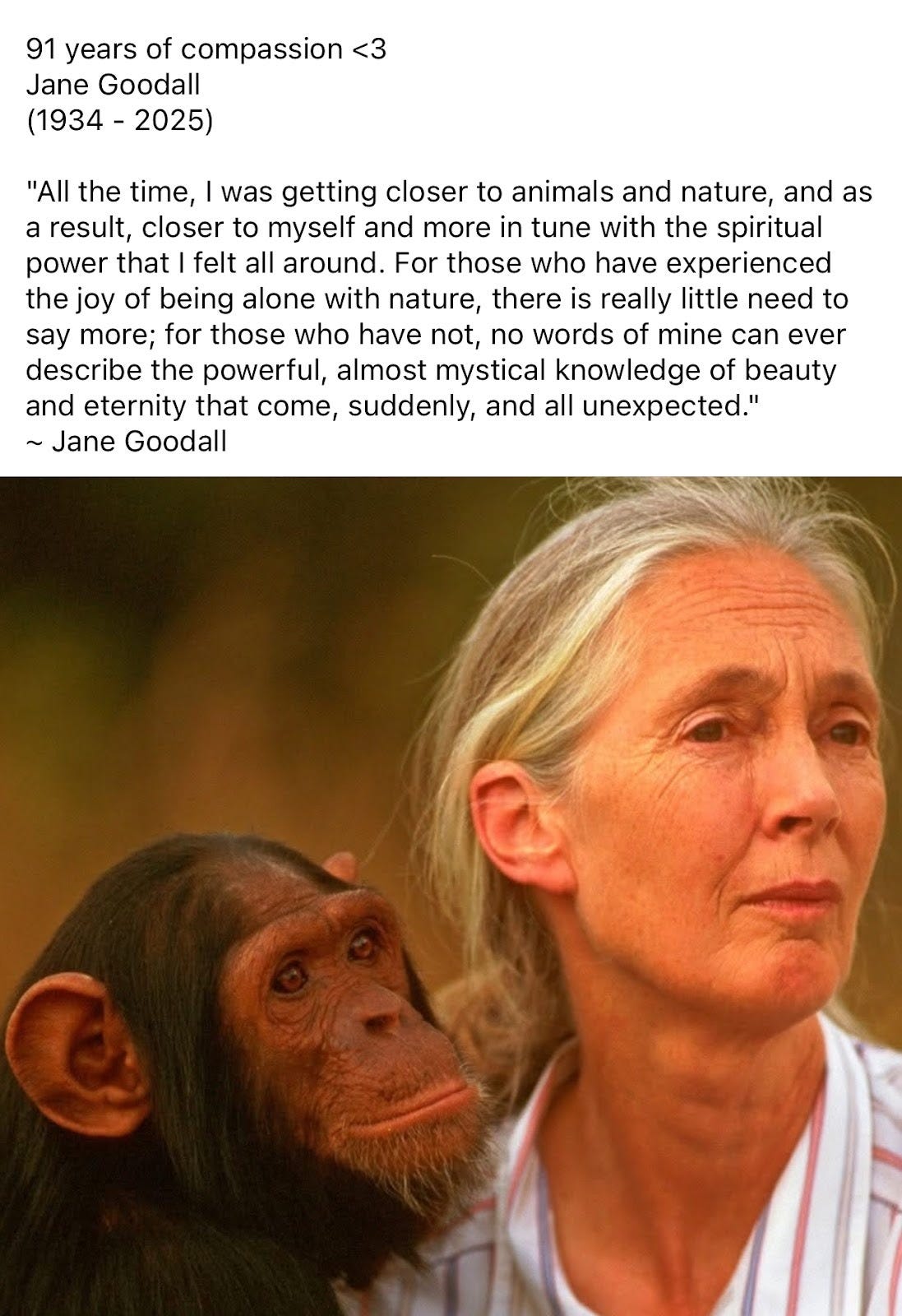 I’ll conclude with Jane Goodall, who helped me make sense of this in her description of a ‘single spiritual entity’ as a great spiritual power, or divine energy, found in every living thing—humans, chimpanzees, trees, and insects alike—that connects all life in a vast, alive web of existence.